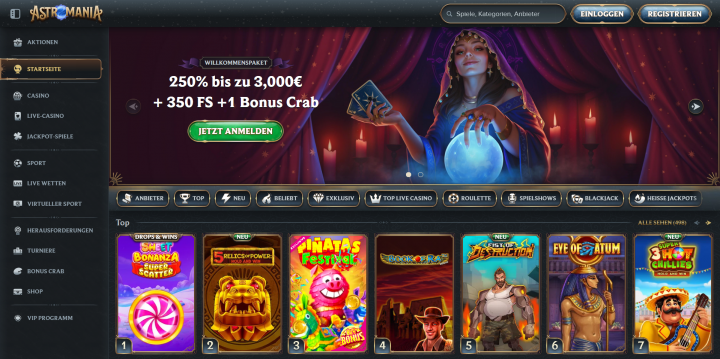 Die Webseite des AstroMania Casinos präsentiert sich in einem dunklen, stilvollen Design mit goldenen Akzenten. Direkt auf der Startseite werden die Besucher vom aktuellen Willkommensangebot begrüßt, das in einem großen Banner ins Auge sticht. Die Navigation ist übersichtlich aufgebaut und auf der linken Seite befindet sich das Hauptmenü mit allen wichtigen Bereichen wie dem Casino, dem Live Casino, den Jackpot Spielen, Sportwetten und Turnieren.