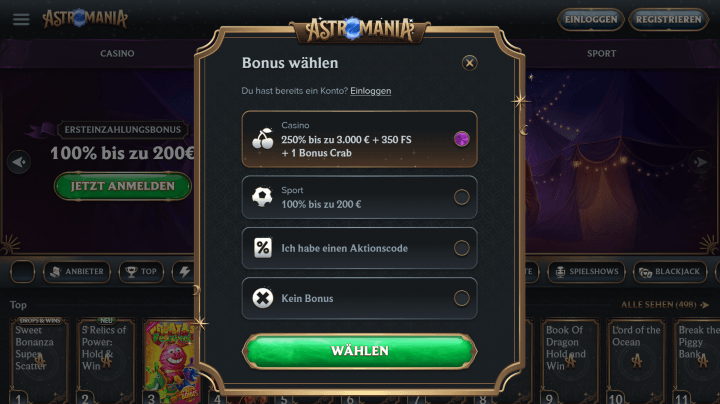 - Du kannst den gewünschten AstroMania Casino Bonus (Casino oder Sportwetten) nun direkt im Kassenbereich aktivieren. Einen AstroMania Bonuscode brauchst du hierfür nicht. Bestätige dann deine Auswahl.