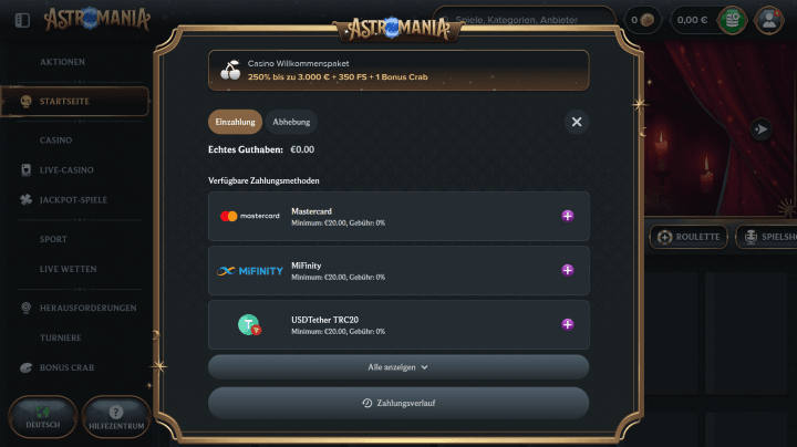 Einzahlungen sind im AstroMania Online Casino bereits ab einem Betrag von 20€ möglich. In unseren AstroMania Erfahrungen wurden Beträge in der Regel sofort gutgeschrieben. Bei der Nutzung von Kryptos hängt die Dauer der Gutschrift von der jeweils verwendeten Blockchain ab. Die verfügbaren Zahlungsmethoden können je nach Land abweichen.