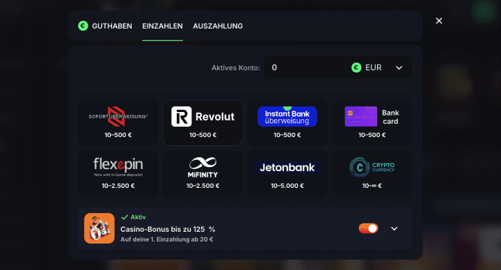 - Dein Konto ist jetzt erstellt und du wirst automatisch in den Kassenbereich weitergeleitet. Dort wählst du deine gewünschte Zahlungsmethode aus, entscheidest dich optional für einen Bonus und nimmst die erforderliche Mindesteinzahlung vor, um mit dem Spielen zu beginnen.