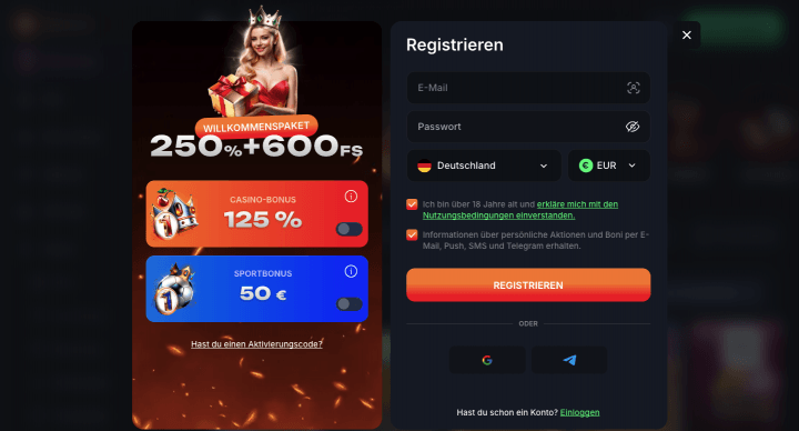 - Nun wählst du deine bevorzugte Registrierungsart aus. Du kannst dich entweder über ein bestehendes Google- oder Telegram-Konto anmelden oder deine E-Mail-Adresse verwenden. Lege anschließend ein Passwort fest, wähle dein Land sowie die gewünschte Währung aus und bestätige dein Alter sowie die AGB und Datenschutzbestimmungen.