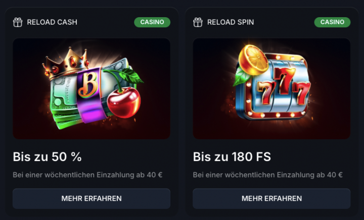 Beim ebenfalls wöchentlichen Reload Freispiel Bonus sicherst du dir ab 40€ Einzahlung Freispiele. Die Staffelung reicht von 35 Freispielen bei 40€, über 85 Freispiele bei 100€ und 130 Freispiele bei 150€ bis hin zu 180 Freispielen bei 200€.