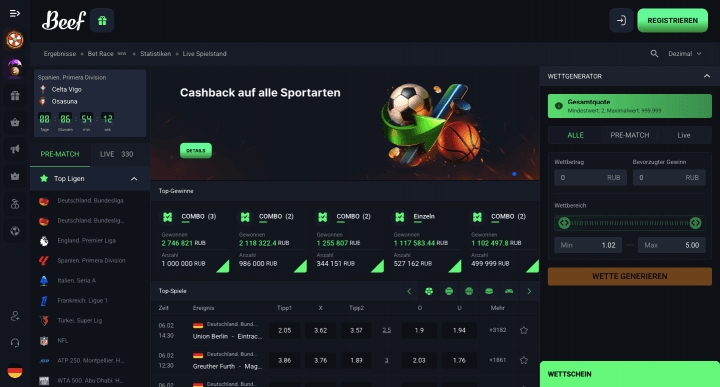 Das Wettangebot im Beef Casino deckt sowohl klassische Sportwetten als auch Live Sportwetten ab und bietet alle gängigen Wettarten, von Siegwetten über Kombiwetten bis hin zu Spezialmärkten. Die Wettquoten bewegen sich insgesamt auf einem soliden Niveau und können sich in vielen Bereichen gut mit anderen Anbietern messen. Neben den populären Sportarten sind auch zahlreiche Randsportarten vertreten, was für zusätzliche Vielfalt sorgt. Ein besonderer Fokus liegt zudem auf dem Bereich E-Sports. Hier stehen unter anderem Wetten auf Counter-Strike 2, Dota 2, League of Legends, VALORANT, Rainbow Six, FIFA, NBA 2K und NHL zur Auswahl.