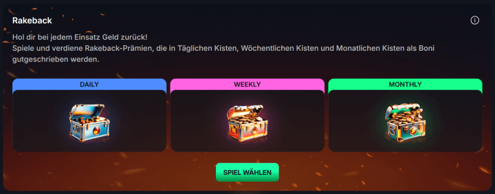 Die Berechnung deines Rakebacks erfolgt auf Basis deiner Echtgeldeinsätze und berücksichtigt den RTP-Wert des Spiels, die Spielkategorie sowie deinen Status. Einsätze aus Live-Roulette und Sofort Spielen mit einem Multiplikator unter 1,3 werden nicht berücksichtigt.