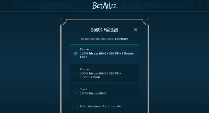 - Es öffnet sich nun direkt ein Fenster, in dem du deinen gewünschten Bonus auswählen kannst. Hier kannst du dich entweder für den Casino- oder Sportwetten Bonus entscheiden, einen BetAlice Bonuscode eingeben oder auf einen Bonus verzichten. Bestätige deine Auswahl dann mit einem Klick auf "Wählen".
