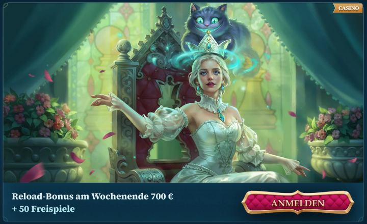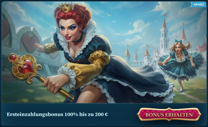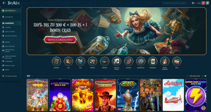 Wenn wir die Webseite des BetAlice Casinos öffnen, fällt sofort das märchenhafte Design auf. Die gesamte Webseite ist inspiriert von der Welt von Alice im Wunderland und du wirst direkt in eine bunte und fantasievolle Atmosphäre gezogen. Trotz der vielen Details wirkt die Seite nicht überladen, sondern klar und geordnet. Links findest du eine übersichtliche Navigation mit allen wichtigen Bereichen wie Casino, Live Casino, Jackpot Spiele oder Sportwetten.