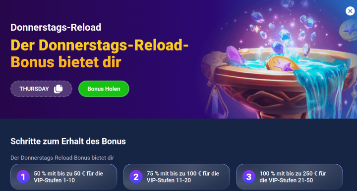 Die Höhe des Reload Bonus am Donnerstag ist dabei abhängig von deinem erreichten VIP-Level innerhalb des VIP-Programms des Casinos. Auch hier betragen die Umsatzbedingungen das 40-fache für das Bonusguthaben sowie die Gewinne, die du mit den Freispielen erzielst.