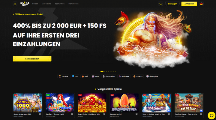 Als neuer Spieler stellt dir das Blitz Bet Casino ein umfassendes Willkommenspaket bereit. Dieses ermöglicht dir, auf deine ersten drei Einzahlungen einen Bonus zu beanspruchen. Oder du entscheidest dich alternativ für einen der beiden Ersteinzahlungsboni.