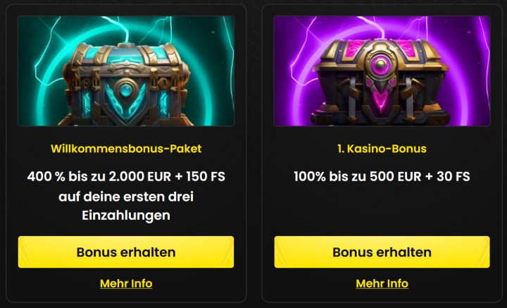 Statt dich für das Willkommenspaket mit 3 Einzahlungsboni zu entscheiden, kannst du dich auch direkt für einen Ersteinzahlungsbonus entscheiden. Jedoch macht es unserer Meinung nach mehr Sinn, das Willkommenspaket zu nutzen.