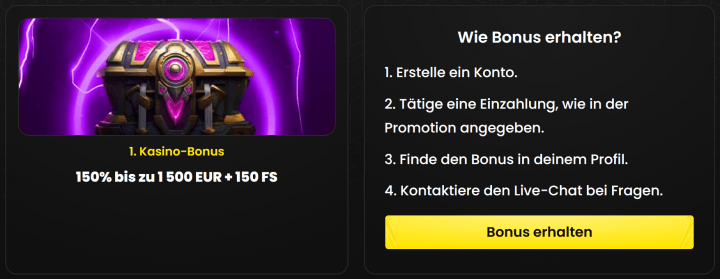 - Ersteinzahlungsbonus - 150% bis zu 1.500€ und 150 Freispiele