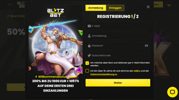 Nach deiner Registrierung kannst du dich auch für den Blitz Bet Sport Bonus für Neukunden entscheiden und deine Ersteinzahlung bis zu einem Betrag von 100€ verdoppeln.