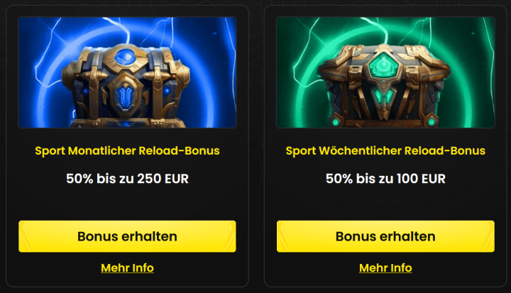 Überdies kannst du als Fan von Sportwetten auch spezielle Angebote für den Wettbereich in Anspruch nehmen. Hier steht dir ein wöchentlicher als auch ein monatlicher Reload Wettbonus bereit.