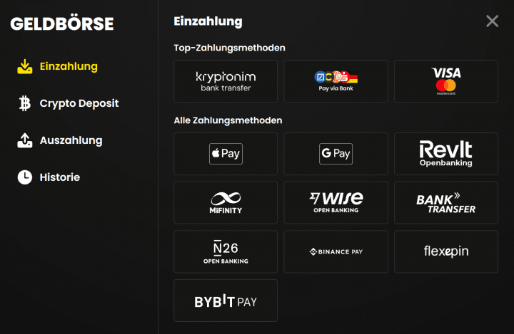Die Mindesteinzahlung beträgt bei allen Einzahlungsmethoden 20€, ausgenommen ist hierbei ByBit Pay da hier Einzahlungen bereits ab 10€ möglich sind. Bedenke jedoch, dass viele Bonusangebote eine Mindesteinzahlung von 20€ bzw. 50€ voraussetzen. Die angebotenen Zahlungsarten kannst du kostenlos und ohne den Aufschlag von Gebühren nutzen.