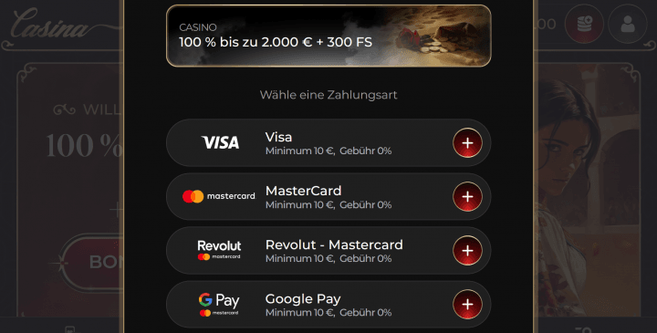 Beachte für die Aktivierung des Bonus, dass eine Mindesteinzahlung von 20€ nötig ist. Das Casina Casino verzichtet dabei komplett auf Gebühren bei Zahlungen.
