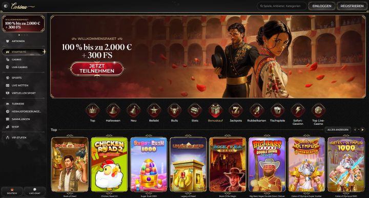 Das Casina Casino präsentiert sich als ein interessanter “Newcomer” unter den neuen Online Casinos, das mit einem umfassenden Spiele- und Wettangebot überzeugt. Besonders positiv fällt der großzügige Willkommensbonus von bis zu 2.000€ und 300 Freispielen auf, der dir einen perfekten Einstieg ermöglicht.