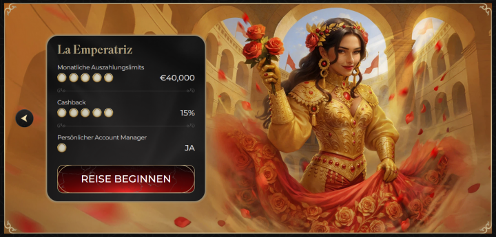 Das VIP-Programm von Casina ist in fünf Stufen unterteilt und begleitet dich auf deiner Reise, die mit der Stufe “Novata” beginnt und mit dem höchsten Status “La Emperatriz” endet. Jede Stufe bietet dir gewisse Vorteile wie höhere Auszahlungslimits, personalisierte Bonusangebote, einen persönlichen VIP-Manager und einen wöchentlichen Cashback Bonus. Der Aufstieg erfolgt durch das Sammeln von Treuepunkten.