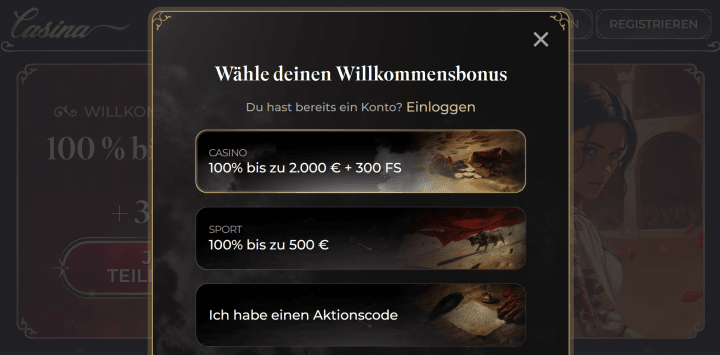 Nach deiner Registrierung steht dir im Casina Casino ein Willkommenspaket mit bis zu 2.000€ Bonusguthaben sowie 300 Freispielen bereit. Dieses kannst du dir über deine ersten drei Einzahlungen sichern. Alternativ hierzu wird dir auch ein Willkommenspaket für das Wettangebot bereitgestellt, mit dem du dir bis zu 500€ Bonus abholen kannst.