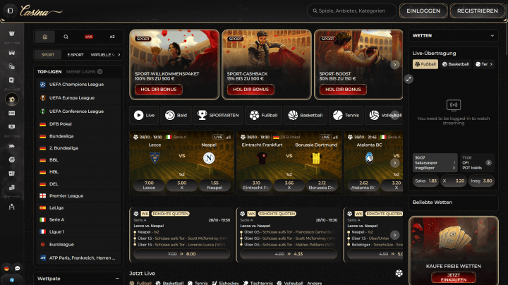 Neben dem Casino-Bereich bietet das Casina Casino auch ein umfangreiches Wettangebot an. Du kannst zwischen klassischen Sportarten, Live-Wetten und virtuellen Spielen wählen. Fußball steht im Mittelpunkt, ergänzt durch weitere Sportarten bzw. Wettmärkte wie Basketball, Tennis, Volleyball, Eishockey, Tischtennis und Darts. Auch internationale Wettbewerbe wie die Champions League, Bundesliga oder Premier League sind als Wettmärkte verfügbar.