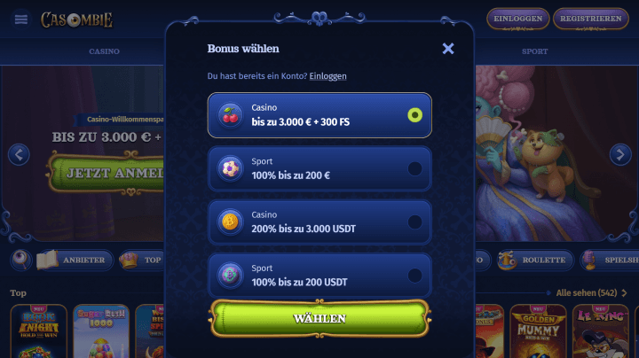 - Damit du auf direktem Weg zur Webseite vom Casombie Casino gelangst, nutzt du idealerweise unseren Link. Die Registrierung sollte sich umgehend öffnen oder du klickst oben rechts auf "Registrieren".