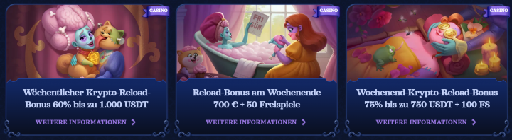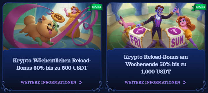 - Montag bis Donnerstag: 50 Freispiele ODER Krypto Bonus 60% bis zu 1.000 USDT