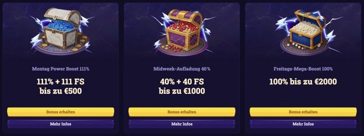 Neben den Reload-Boni gibt es zusätzlich noch die Bonuskarte. Dort findest du jeden Tag wechselnde Angebote, mit denen du dir ein Bonusguthaben, Freispiele oder sogar beides sichern kannst.