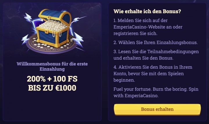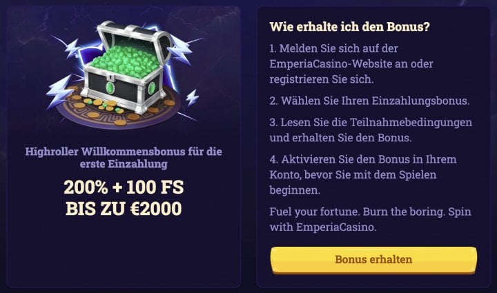 Bei unserem Emperia Casino-Test konnten wir ungewöhnlich viele Bonusangebote entdecken. Neben dem 3.500€ Willkommenspaket steht auch ein Highroller Ersteinzahlungsbonus bereit. Wöchentlich hast du Zugriff auf weitere Reload-Boni sowie Bonusangebote der täglichen Bonuskarte.