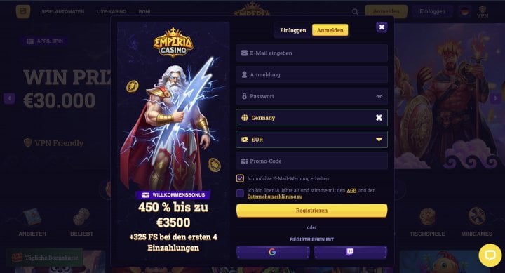 So einfach läuft die Registrierung im Emperia Casino und die Einlösung des Willkommensbonus ab