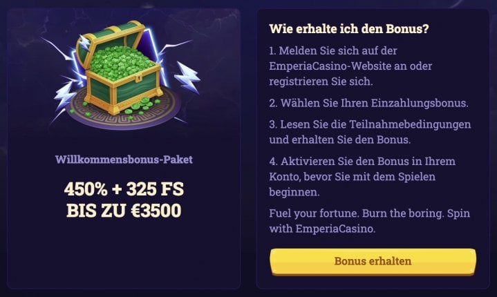 Emperia Casino Willkommensbonus – umfassendes Willkommenspaket mit bis zu 3.500€ Bonus und 325 Freispielen