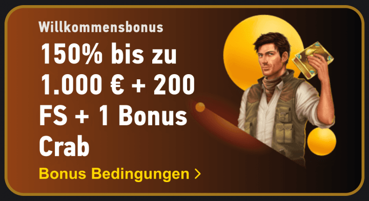 Bei deiner ersten Einzahlung kannst du das exklusive Willkommenspaket in Anspruch nehmen. Dir stehen dann 150% bis zu 1.000€, 200 Freispiele sowie eine Bonus Crab zur Verfügung. Alternativ hast du auch die Option, dich für den regulären Bonus zu entscheiden, oder du nutzt das Angebot für Sportwetten. Später gibt es regelmäßige Bonusaktionen und Cashback für alle Bereiche.