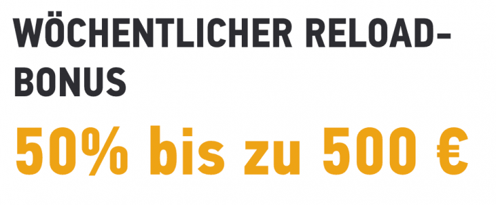 - Sportwetten Reload Bonus (1x pro Woche) – 50% bis zu 500€