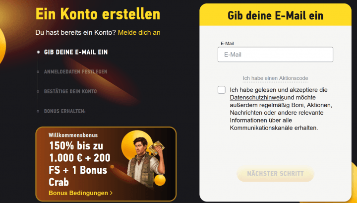 - Zunächst wirst du nach deiner E-Mail-Adresse gefragt. Du stimmst den Datenschutzrichtlinien zu und akzeptierst, dass dir E-Mails zu Boni und Aktionen zugeschickt werden.