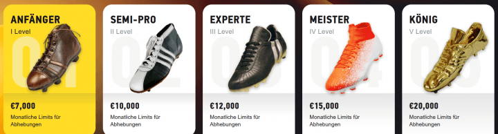 Mit deiner Registrierung nimmst du automatisch an dem mehrstufigen VIP-Programm teil. Insgesamt werden 5 Stufen angeboten, bei denen du mit immer mehr Vorteilen dein Spielerlebnis optimieren kannst. Es warten neben individuellen Bonusangeboten, ein wöchentliches Cashback (ab Stufe 3 – Experte) sowie höhere Auszahlungslimits pro Monat. Es gibt für die oberen Stufen sogar einen persönlichen Ansprechpartner.