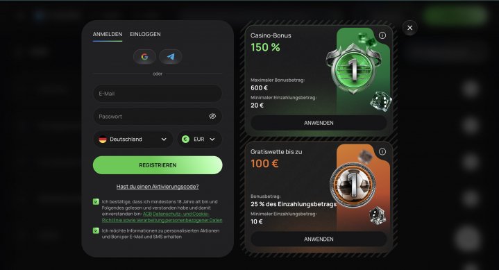 - Im nächsten Schritt wählst du die gewünschte Anmeldeart. Du kannst entweder ein bestehendes Google- oder Telegram-Konto nutzen oder dich klassisch mit deiner E-Mail-Adresse registrieren. Anschließend vergibst du ein Passwort, wählst dein Wohnsitzland sowie die Kontowährung aus und bestätigst dein Alter sowie die geltenden Nutzungsbedingungen.