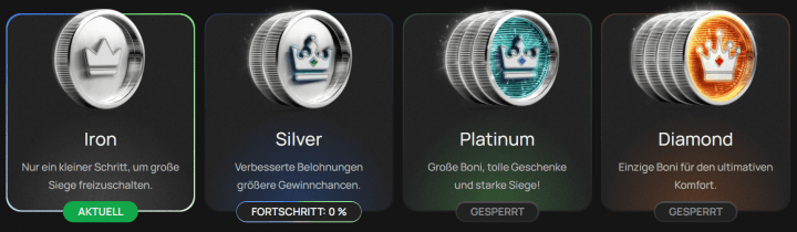 Das VIP-Programm im Flagman Casino richtet sich klar an Spieler, die aktiv sind und auch fortlaufend Einzahlungen vornehmen. Insgesamt gibt es vier Stufen. Die VIP-Level tragen die Bezeichnungen Iron, Silver, Platinum und Diamond. Dein Fortschritt basiert auf einem Punktesystem. Jedes Mal, wenn du Geld auf dein Spielerkonto einzahlst, sammelst du Punkte. Für jeweils 10€ Einzahlung wird dir 1 Punkt gutgeschrieben.