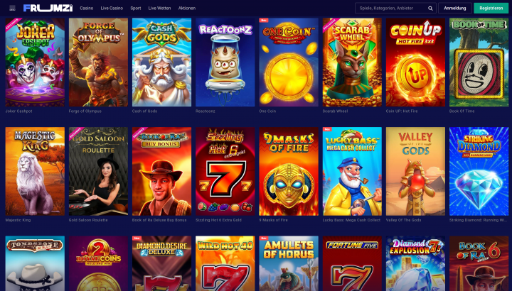 In unserem Frumzi Casino Test haben wir uns intensiv mit dem Sortiment bei den Spielen auseinandergesetzt. Dabei handelt es sich nicht nur um Slots. Es werden auch Jackpot-Spiele, Video Poker und Live Casino Spiele angeboten. Das Angebot an Glücksspielen wird durch die Sportwetten, Live-Wetten und virtuellen Sport noch abgerundet.