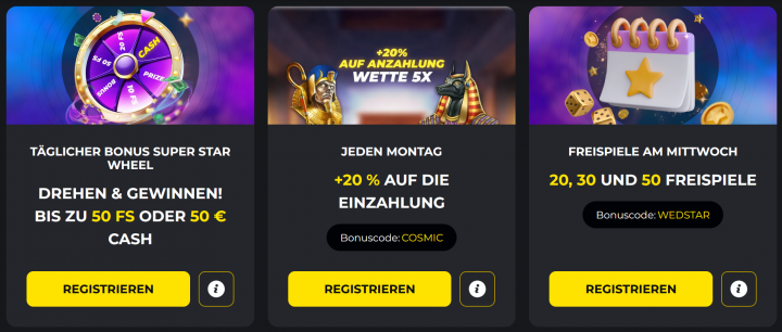Am Montag erhältst du einen 20% Bonus, sofern du eine Mindesteinzahlung von 20€ vornimmst und den Bonuscode "COSMIC" angibst. Für den Bonus gelten die 5-fachen Umsatzbedingungen und ein maximales Gewinnlimit von 2.000€. - Freispiele am Mittwoch