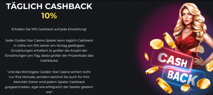 Im GoldenStar Casino profitierst du von einem täglichen Cashback Bonus in Höhe von 10%. Die Gutschrift richtet sich nach deinen Einzahlungen vom Vortag und wird unabhängig davon vergeben, ob du Gewinne erzielt hast oder nicht. Damit wird nicht nur ein möglicher Verlust ausgeglichen, sondern deine generelle Spielaktivität zusätzlich belohnt.