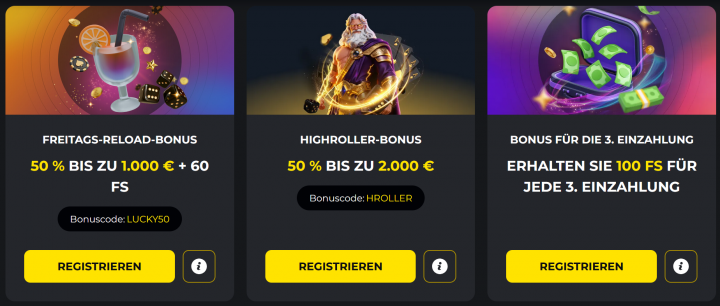 Mit dem Bonuscode "LUCKY50" und einer Mindesteinzahlung von 40€ kannst du jeweils am Freitag einen 50% Reload Bonus mit 60 Freispielen beanspruchen. Die Freispiele werden dir über drei Tage hinweg zu jeweils 20 Freispielen gutgeschrieben. - Wöchentlicher Highroller Bonus bis zu 2.000€