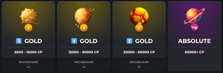 Das Treueprogramm gliedert sich in mehrere Statusstufen. Du startest auf dem Bronze-Level und kannst dich über Silber bis hin zu Gold hocharbeiten. Jede dieser Stufen besteht aus fünf Unterlevels, wodurch der Fortschritt regelmäßig spürbar bleibt. Jeder Aufstieg bringt dir verbesserte Konditionen und zusätzliche Vorteile. Als höchste Stufe wartet der Status Absolute VIP. Dieser Rang richtet sich an besonders aktive Spieler und markiert das obere Ende des Treueprogramms. Wer diesen Status erreicht, profitiert von den bestmöglichen Umtauschverhältnissen für CP und exklusiven Privilegien innerhalb des Casinos.