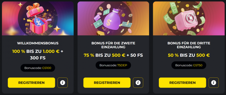 Beim Blick auf die Bonusangebote von GoldenStar Casino fällt auf, dass es sowohl für neue als auch für bestehende Spieler attraktive Aktionen gibt. Direkt nach der Registrierung kannst du einen Einzahlungsbonus erhalten, der deine erste Einzahlung ergänzt und dir ein zusätzliches Spielguthaben bringt. Ergänzend gibt es regelmäßig Promotionen, bei denen du von weiteren Boni profitieren kannst. Freispiele und Bonusaktionen werden häufig angeboten, was deine Chancen auf zusätzliche Gewinne erhöht.
