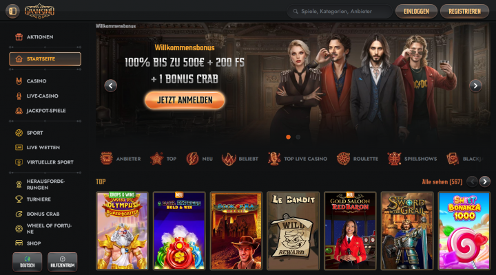 Die Webseite vom Gransino Casino ist dunkel gehalten, und schon der erste Blick verrät, dass die Spiele hier im Mittelpunkt stehen. Das Logo schimmert dabei golden und fällt umso mehr auf. Auf der Startseite sind auch die Angebote für Neukunden zu finden, sodass man sofort weiß, was einen nach der Anmeldung erwartet.