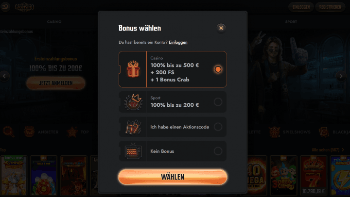 Du kannst dich schon bei der Registrierung für deinen favorisierten Bonus entscheiden, der dir bei deiner Ersteinzahlung gutgeschrieben wird. Für die Automatenspiele kannst du dir dabei einen 100% Bonus bis zu 500€ sichern. Zusätzlich werden dir noch 200 Freispiele gutgeschrieben und du erhältst eine Bonuskrabbe.