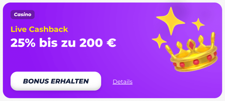 Wir haben die Spielauswahl überprüft und konnten uns neben vielen Spielautomaten auch von den Live Spielen überzeugen. Dazu werden noch Sportwetten angeboten, sodass das Angebot abgerundet wird. Mit unserem Link steht dir sogar ein exklusiver Willkommensbonus zur Verfügung. Neben Bonusguthaben und Freispielen gibt es noch eine Bonus Crab. Als Bestandskunde kannst du zudem auf Reload Boni auch im Sportbereich zugreifen. Es gibt dabei auch einen Live Cashback und Sport Cashback, der jedoch jede Woche beantragt werden muss.