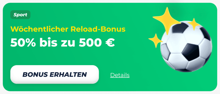 - Sportwetten Reload Bonus (1x wöchentlich) – 50% bis zu 500€