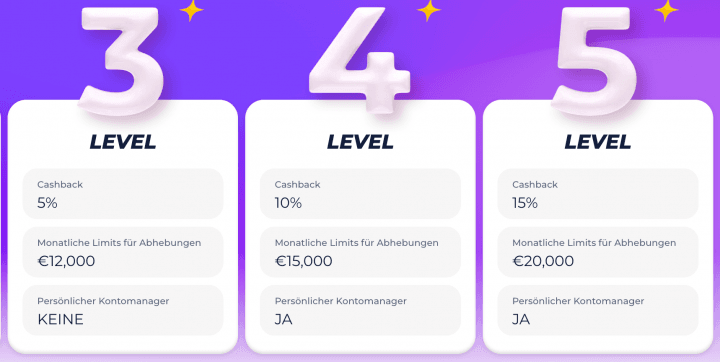 Du nimmst automatisch am VIP-Programm teil, nachdem du dich angemeldet hast. Hierbei gibt es 5 verschiedene Stufen, bei denen deine Vorteile immer besser werden und dein Spielerlebnis optimieren. Neben exklusiven Bonusangeboten, gibt es auch noch ein wöchentliches Cashback (ab der 3. Stufe) sowie steigende Auszahlungslimits. Die oberen zwei Stufen können zudem auf einen persönlichen VIP-Manager zurückgreifen.