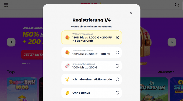 - Sollte die Anmeldung nicht automatisch beginnen, kannst du oben rechts auf der Seite auf den Registrieren Button „Anmelden“ klicken, damit sich das Formular öffnet. Wähle im ersten Schritt den passenden Bonus aus und folge den nächsten Schritten.
