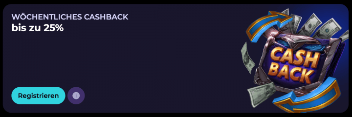 Sobald du deinen VIP-Status erreicht hast, kannst du auch einen Cashback Bonus von 25% erhalten. Dieser wird jedoch von einem VIP-Manager freigeschaltet und kann nicht standardmäßig genutzt werden.
