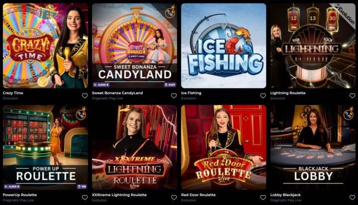 Crazy Time, Ice Fishing, Lightning Roulette, Crazy Coin Flip, Mega Wheel
