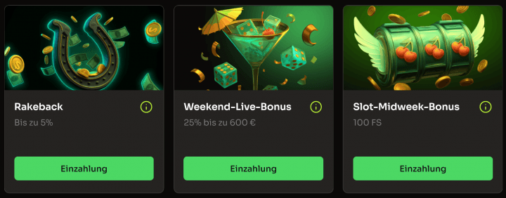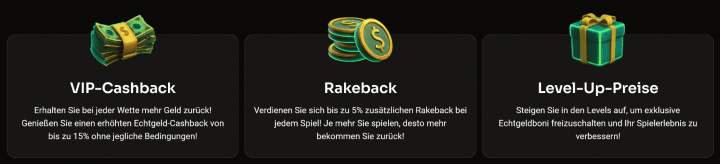 Basierend auf der von dir erreichten VIP-Stufe bekommst du dann zusätzlich noch einen wöchentlichen Cashback Bonus von bis zu 15% sowie einen Rakeback von maximal 5% gutgeschrieben. Es werden auch Spielautomaten Turniere wie die Drops & Wins Aktion von Pragmatic Play, die Spinoleague von Spinomenal und weitere Aktionen angeboten.