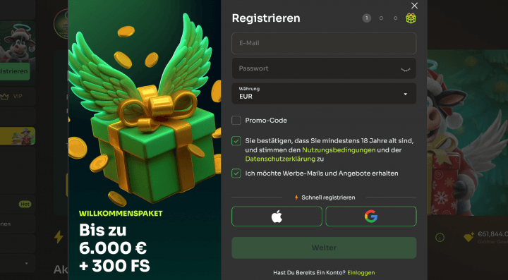 - Gib in das Registrierungsformular zuerst deine E-Mail-Adresse sowie ein Passwort ein und wähle dann deine gewünschte Währung aus. Bestätige danach, dass du volljährig bist und den AGB sowie den Datenschutzbestimmungen zustimmst. Klicke dann auf den Button “Weiter”. Alternativ kannst du dich auch mit deinem Apple- oder Google-Account registrieren.